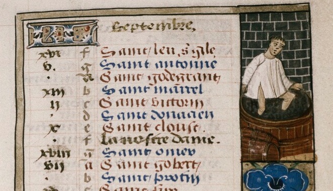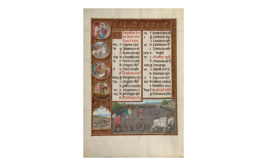 In these perpetual calendars, each month of the year was given its own page, each of which featured two images: one of the labor of the month, and one of that month’s zodiacal sign. Since all the labors were agricultural, the specific labor of the month may vary according to where a book was made or the region of a book’s intended market. For instance, the most common labor for September was treading grapes, but images of harvesting grapes as well as images of sowing and plowing also appear on calendar pages for September. Find examples of these labors in the form of the following pictorial list: