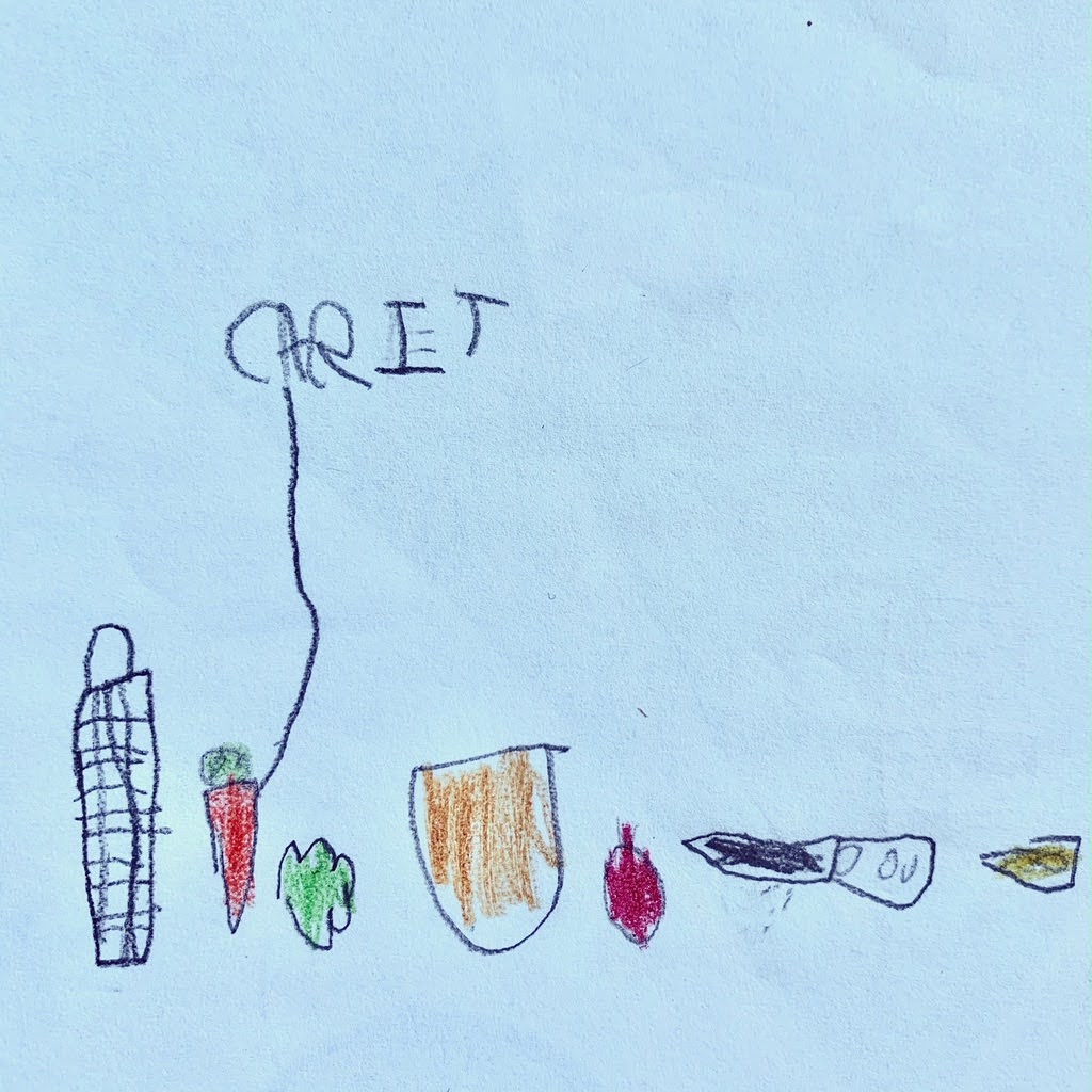 A third example of the look of a list selected from our Instagram feed suggests just such an eventuality: that an encounter with “listiness”–whether in a visual or narrative form–brings on the urge to make a list. In this creation of a seven-year-old artist and budding list-writer, we find a side-by-side arrangement of objects depicted in crayon at the foot of the page and a vertical black line connecting one of the objects–a carrot–to the word “carit,” written in the upper half of the page. An interview with the artist confirms that he drew the display of objects first and then wrote out the word carit. The call of other activities prevented him from adding to this list so clearly begun, but as we know, once launched a list can go on.