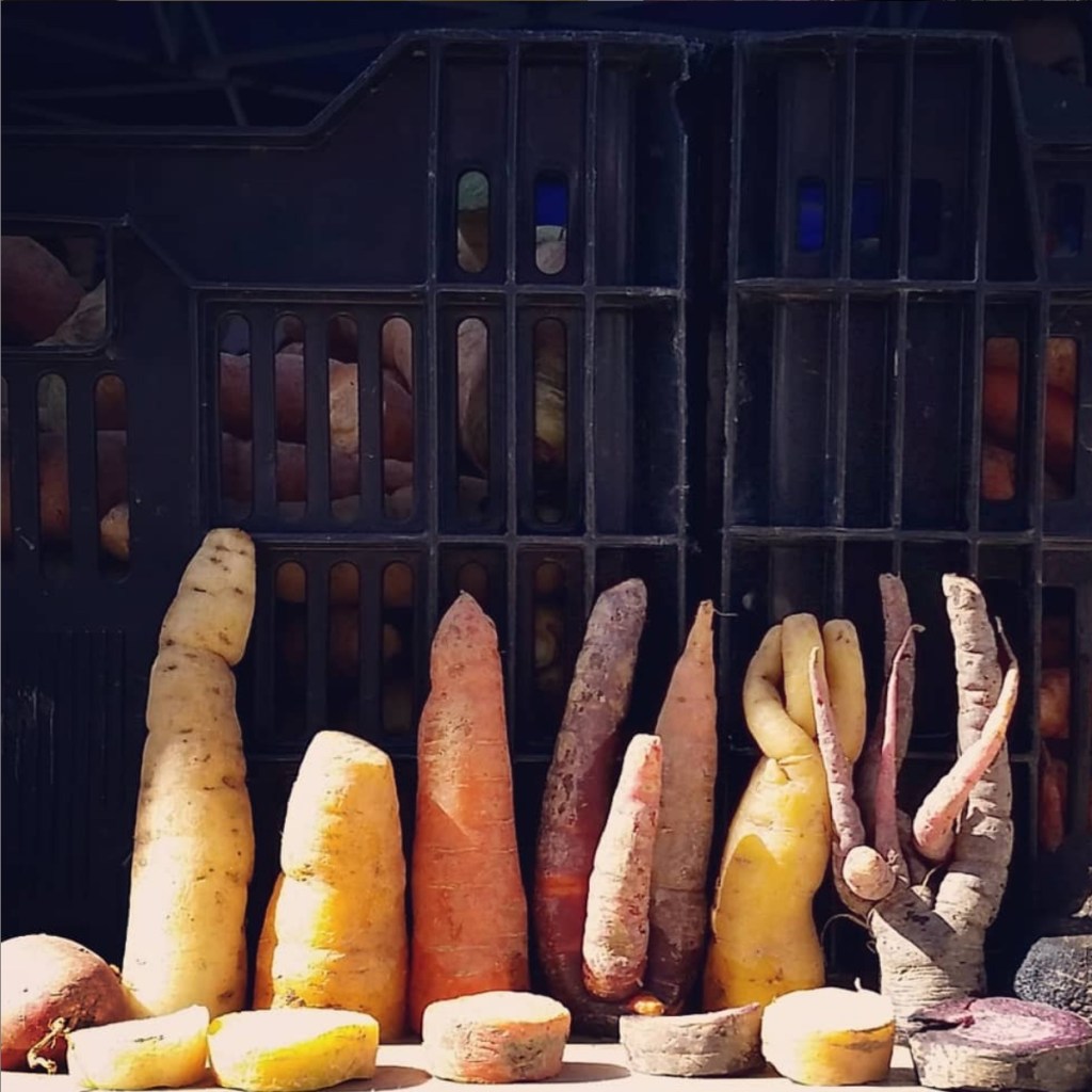 A list-seeker may have better luck when faced with a similar display of elongated objects placed side by side: this one of carrots at a farmers’ market stand in New York City. The caption for our Instagram photo of the collection reads, “a list?” Not exactly, according to Sève, but here too, the carrots’ side-by-side arrangement creates a sense that they form a list: specifically, a list of the varieties of carrots for sale at this stand. In this situation the creator of the pseudo-list is likely to be nearby and happy to name each variety of carrot represented in the collection, which enumeration would still not qualify as a list in Sève’s view since for him a list must be written. That said, Sève asserts that an arrangement with the look of a list may yet give rise to the sentiments a list provokes, which for him run the gamut from boredom to joy (de l’ennui à la jubilation).[6] Delight surely falls in that spectrum, and thanks to this display of carrots, certainly more than one farmers’ market shopper counted a dollop of that sentiment among their market finds, whether or not they bought carrots. With a memory of the stand keeper’s recitation of the names of the types of carrots in this ensemble, such a shopper would also be able to write them down as a list.