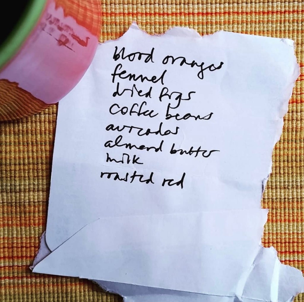 Although most of Sève’s examples of collections of objects and pictures with l’allure de liste exhibit a side-by-side arrangement–as all three of my examples here have done as well–the very title of his book alludes to his opinion that the definitive list arrays words vertically, such that one reads them de haut en bas (from top to bottom). This arrangement, Sève asserts, assures the independence of each list item from the next and from the one before.[7] Using the case of a grocery list, he further observes that there is something natural about writing lists this way: “Il me semble que c’est spontanément en colonne que l’on écrit sa liste de courses” (It seems to me that one spontaneously writes one’s grocery list in a column).[8] In our inaugural post on this blog, posted on April 21, 2018, we similarly asserted that the “iconic” list is arranged vertically and, further, that this format attracts viewers’ and readers’ eyes. In other words, applying a cross-language twist to Sève’s idea of the look of a list, the columnar allure de liste has alure, in the English sense of attraction or fascination.[9] Interestingly, as the first post in our Instagram feed, posted the same day, we chose–as if to exemplify both the look of a list and its alure?–this photo of a grocery list.