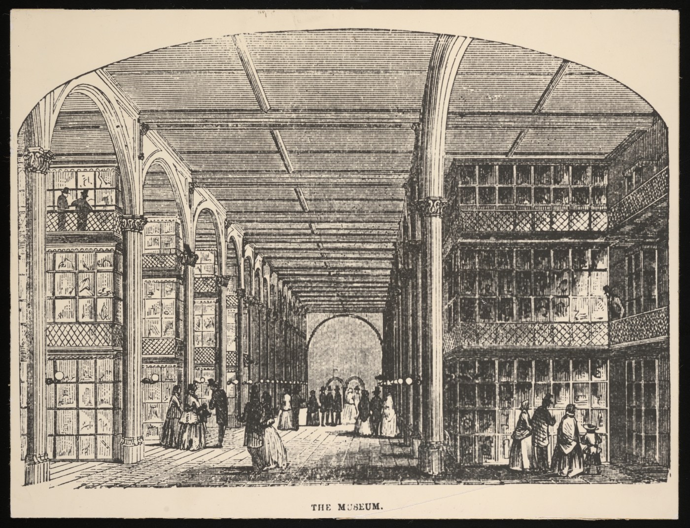 With its strengths in science and technology, Washington’s new National Museum stood in marked contrast to the several New York City American Museums that had existed since the 1790s, mostly consisting of a motley array of natural history specimens—galleries of taxidermied animals, wax figures, miscellaneous curiosities, and various types of panoramas. These museums of curiosities, an urbanization of provincial itinerant side-shows, also flourished during the early to mid-19th century in cities such as Philadelphia, Cincinnati, and Cleveland. During the period of debate over the establishment of the Smithsonian Institution, P.T. Barnum undertook to construct a collection of “natural curiosities” on a monumental scale. In 1841 he purchased Scudder’s American Museum building at the corner of Broadway and Ann Street in New York along with its tired collection of natural history specimens, and he transformed it into Barnum’s American Museum: five floors full of galleries with a head-spinning variety of curiosities and wonders, with an elaborate “lecture hall” that rivaled any theater in the city. By 1842 an ad for the American Museum boasted “over 500,000 curiosities:”