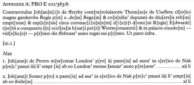 - While Feriby’s counter-roll was partially translated in 1836, the first part of the document, which lists cloth purchases, “was deemed of such little interest that it was not included,” demonstrating how texts like this can be disregarded in favor of more celebrated accounts like coronation rolls. Lisa Monnas, “Textiles for the Coronation of Edward III,” Textile history 32, no. 1 (2001): 2. ↩︎