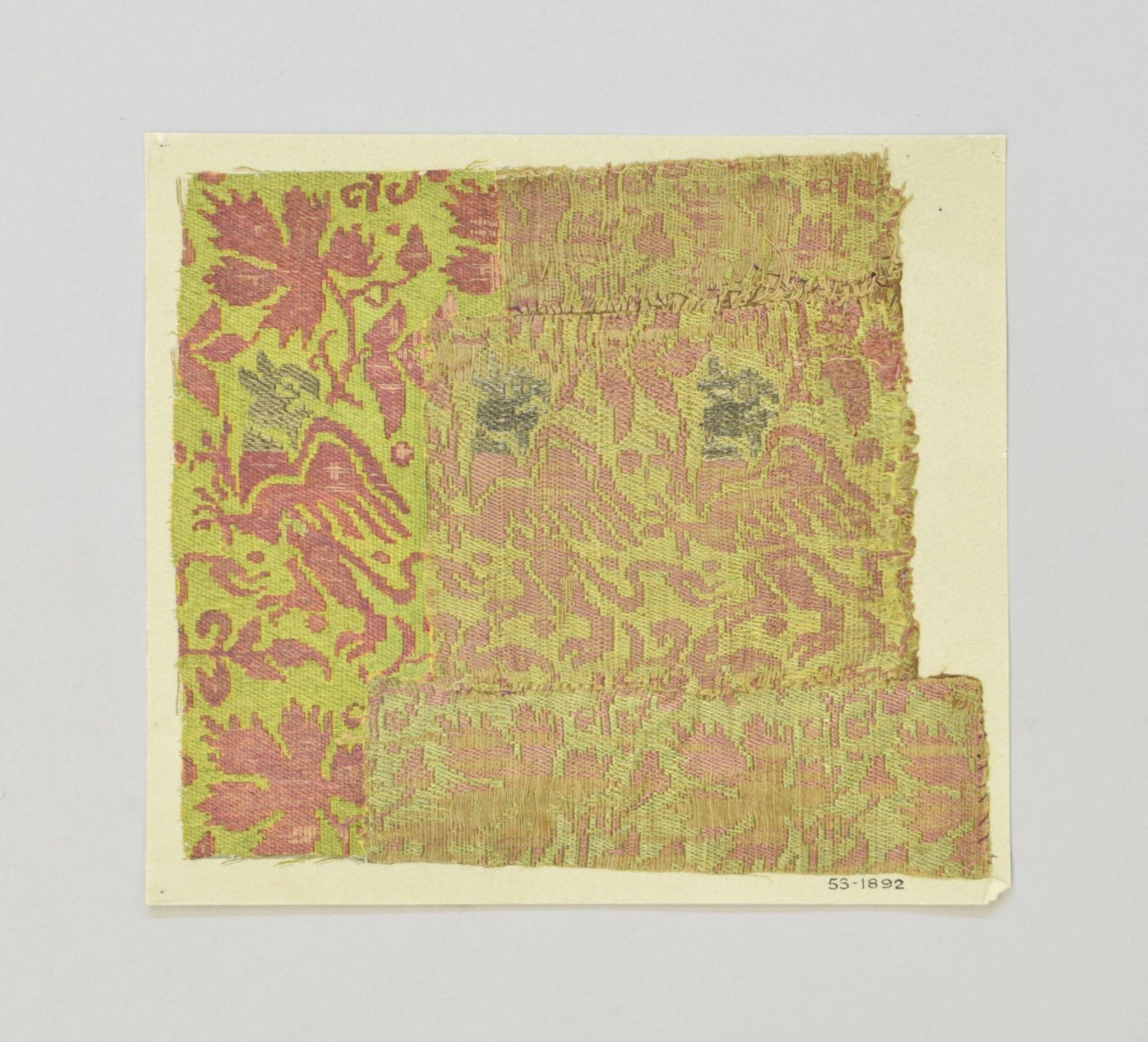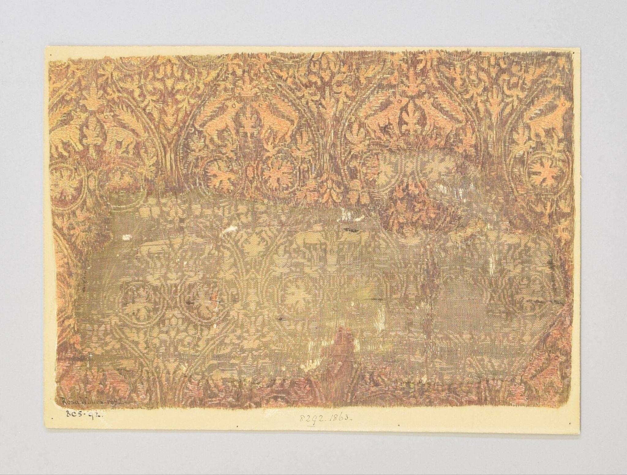 - Textile fragment, 14th century, woven half-silk (linen warp and silk wefts) with the design completed in watercolor, 20.5 by 18.7 cm. Victoria & Albert Museum, London, accession no. 53-1892. Accessed June 28, 2025, ↩︎