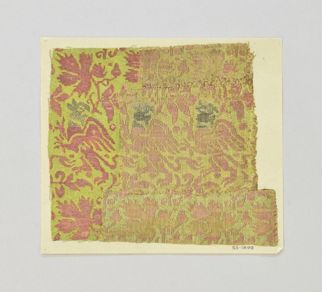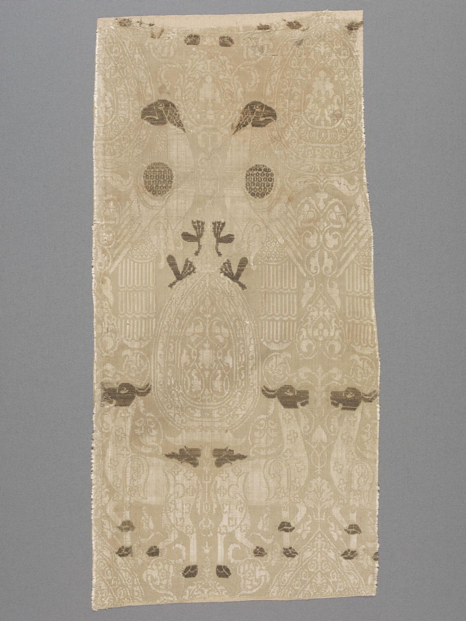 - Silk fragment, c. 1275-1325, diasper silk, brocaded silver, 26.5 by 55.3 cm. Victoria & Albert Museum, London, accession no. 1274-1864. Accessed June 28, 2025. ↩︎