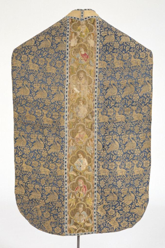 - The Clare Chasuble, c. 1272-1294, silk and metal on blue silk and cotton in satin weave, 80 by 124 cm. Victoria & Albert Museum, London, accession no. 673-1864. Accessed August 22, 2025, ↩︎