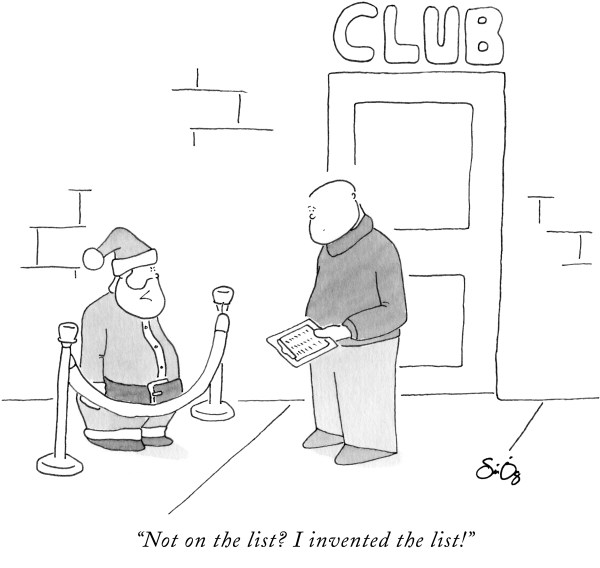 In a cartoon by Sean O’Neill published in the New Yorker, Santa Claus stands behind a rope barrier looking decidedly not jolly.[1] On the other side of the rope stands a man holding a clipboard with a sheet of paper showing three columns of text. Above the door behind him, a sign reads “Club.” The cartoon’s caption translates Santa’s dour look as outrage: “Not on the list? I invented the list!” Continue reading “Lists of names: Santa’s in particular”